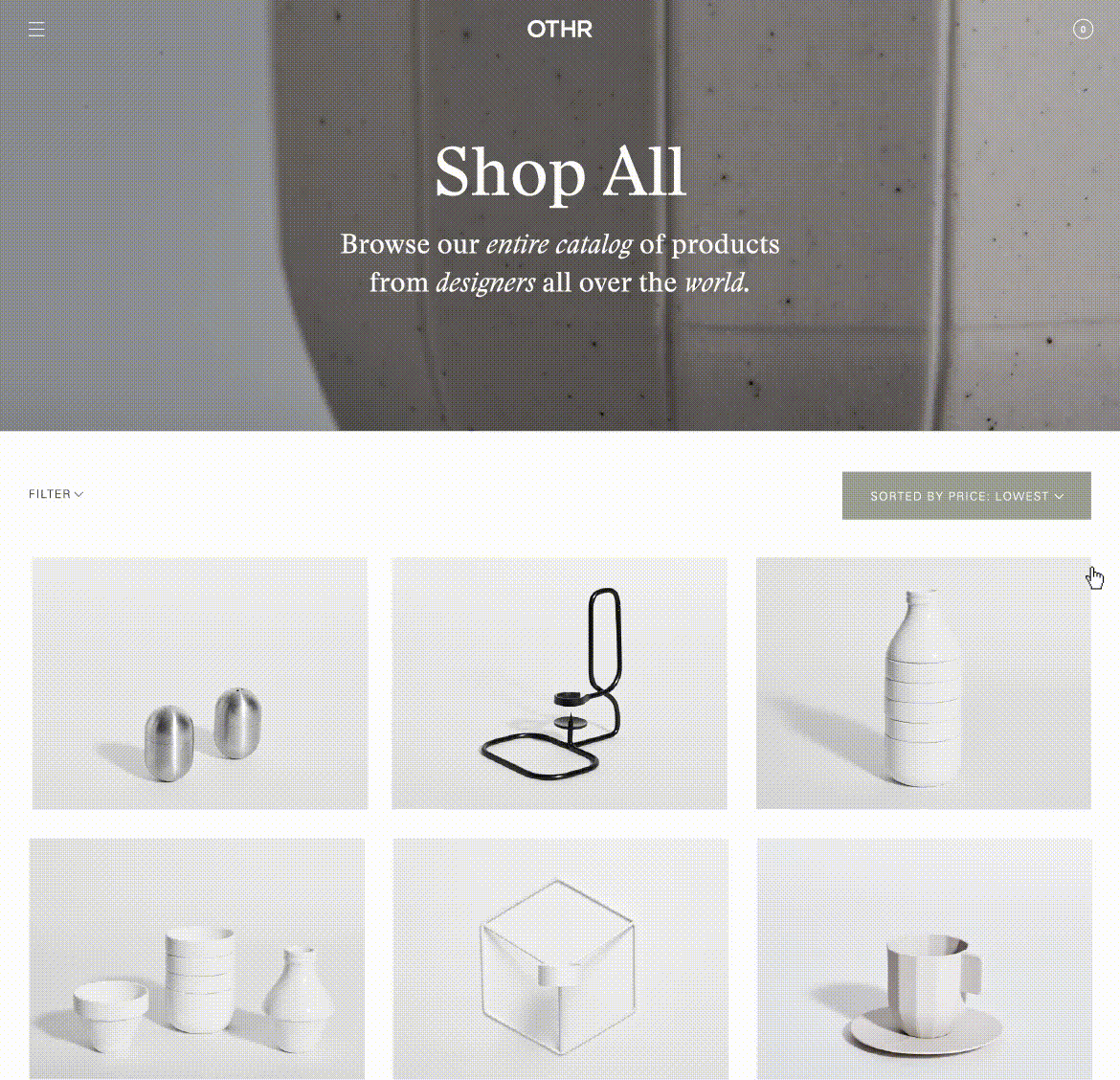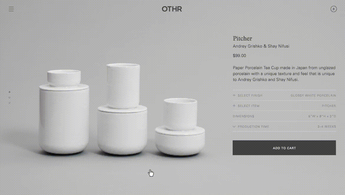 OTHR brings together the world’s best industrial designers to offer unique objects on-demand and direct-to-consumer through innovative 3D printing technology. Their wares do not physically exist until a customer chooses to own one, and each piece is embedded with a unique serial number to reflect that. Gin Lane helped realize their bold vision by designing and developing a bespoke e-commerce website that integrated products and orders directly with 3D printing software, while also showcasing the brand’s rich design content produced in collaboration with FvF.